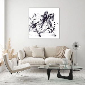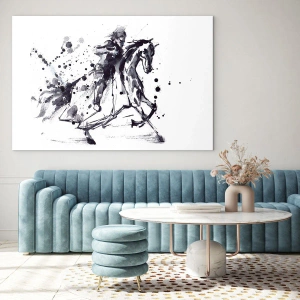 Impression sur verre - Image sur verre - Peinture en noir et blanc d'un cavalier sur un cheval dans un style abstrait - 50x70cm - Chevalier noir - Décoration murale moderne pour le salon et la chambre ARTTOR