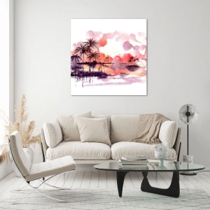 Impression sur verre - Image sur verre - Paysage tropical au coucher du soleil à l'aquarelle - 50x70cm - La tranquillité des tropiques en rouge - Décoration murale moderne pour le salon et la chambre ARTTOR