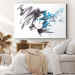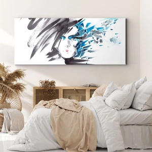 Impression sur toile - Image sur toile - Peinture faciale artistique à l'aquarelle avec des accents bleus - 70x50cm - Portrait sensuel en gris et bleu - Décoration murale moderne pour le salon et la chambre ARTTOR