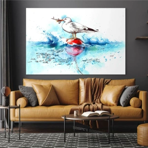 Impression sur verre - Image sur verre - Une mouette sur une bouée avec un poisson en arrière-plan des vagues de la mer - 50x70cm - Prise réussie - Décoration murale moderne pour le salon et la chambre ARTTOR