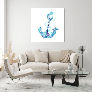Impression sur verre - Image sur verre - Ancre abstraite dans des tons de bleu avec des détails nautiques - 70x100cm - Le confident des secrets de la mer - Décoration murale moderne pour le salon et la chambre ARTTOR