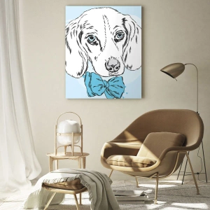 - Cette estampe sur verre représente un chien portant un élégant nœud papillon sur un fond bleu clair. Parfaite pour les intérieurs modernes et les amoureux des animaux.