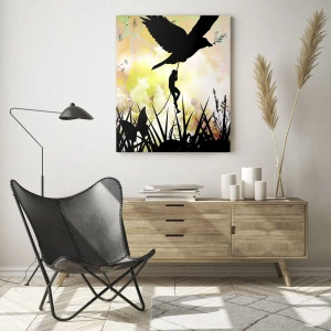 Impression sur verre - Image sur verre - Illustration d'une figure grimpant sur un oiseau sur un fond de fleurs colorées. - 50x70cm - Dans une ambiance de conte de fées - Décoration murale moderne pour le salon et la chambre ARTTOR