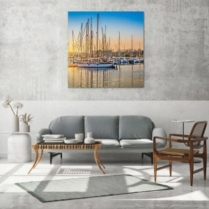 Impression sur verre - Image sur verre - Une marina pleine de voiliers à la lumière du soleil couchant - 70x50cm - Le vent aussi doit dormir - Décoration murale moderne pour le salon et la chambre ARTTOR