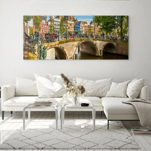 Impression sur verre - Image sur verre - Un canal pittoresque avec un pont à Amsterdam - 140x50cm - Le printemps sur le canal - Décoration murale moderne pour le salon et la chambre ARTTOR