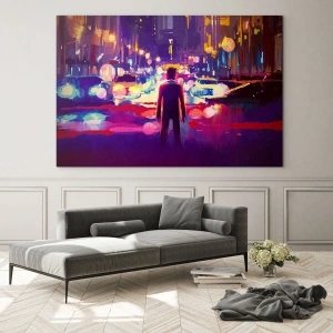 Impression sur verre - Image sur verre - Une silhouette dans une veilleuse urbaine colorée et futuriste - 50x70cm - Immergé dans la lumière - Décoration murale moderne pour le salon et la chambre ARTTOR