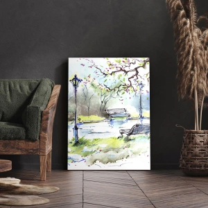 - Cette toile représente une scène printanière dans un parc, avec bancs et lampes, dans un style aquarelle. Des détails et des couleurs subtils apportent harmonie et tranquillité.