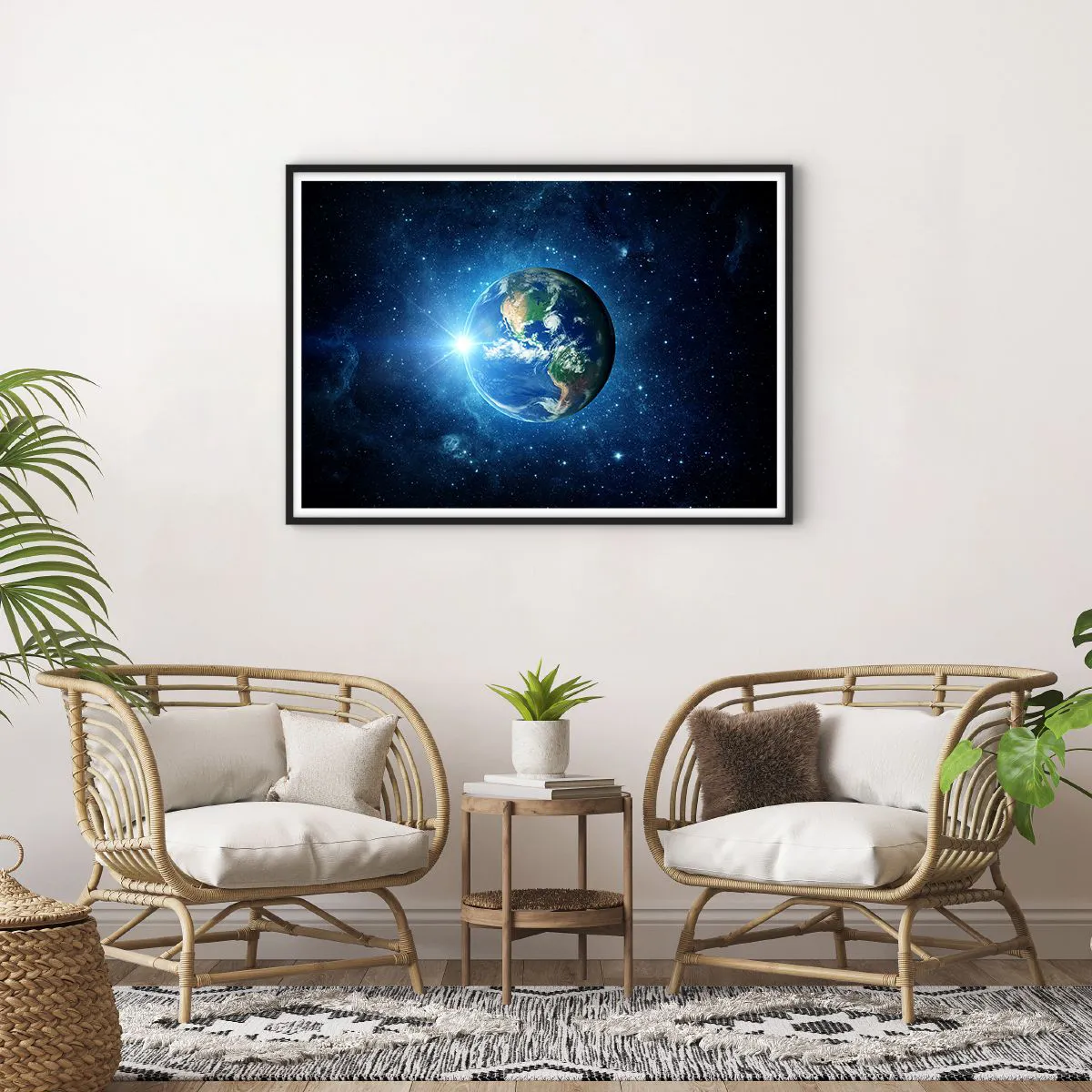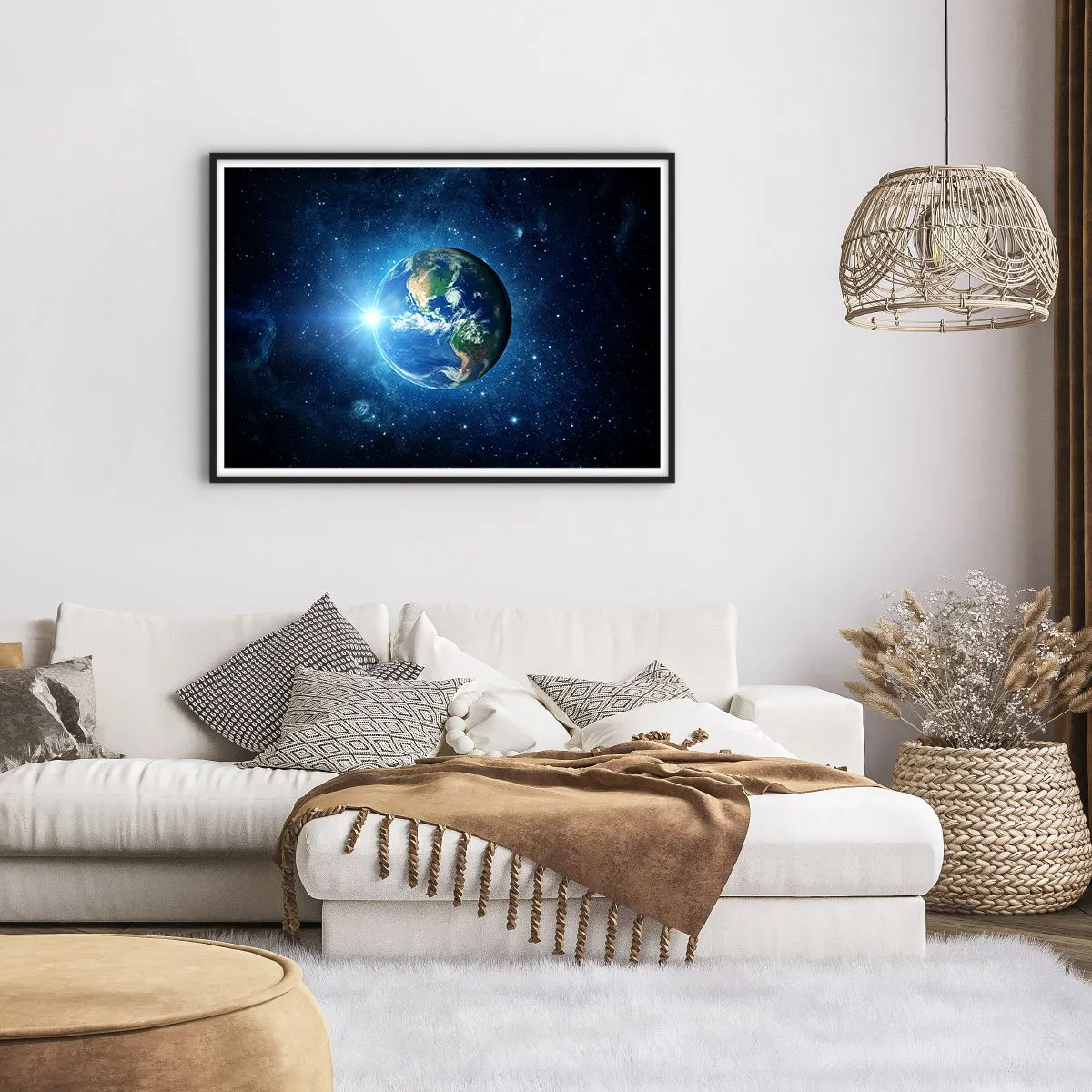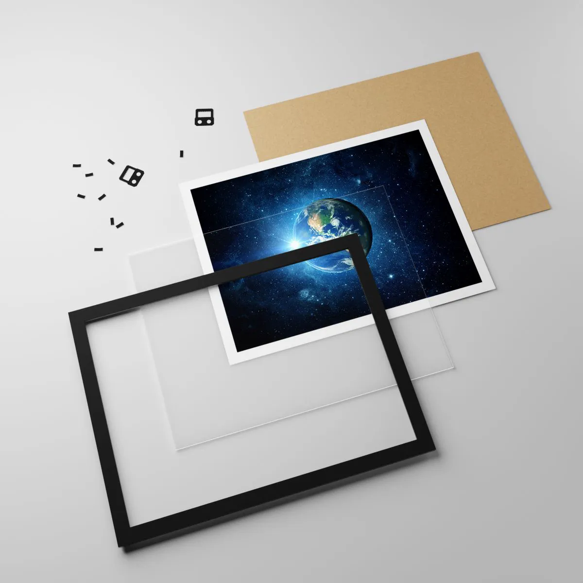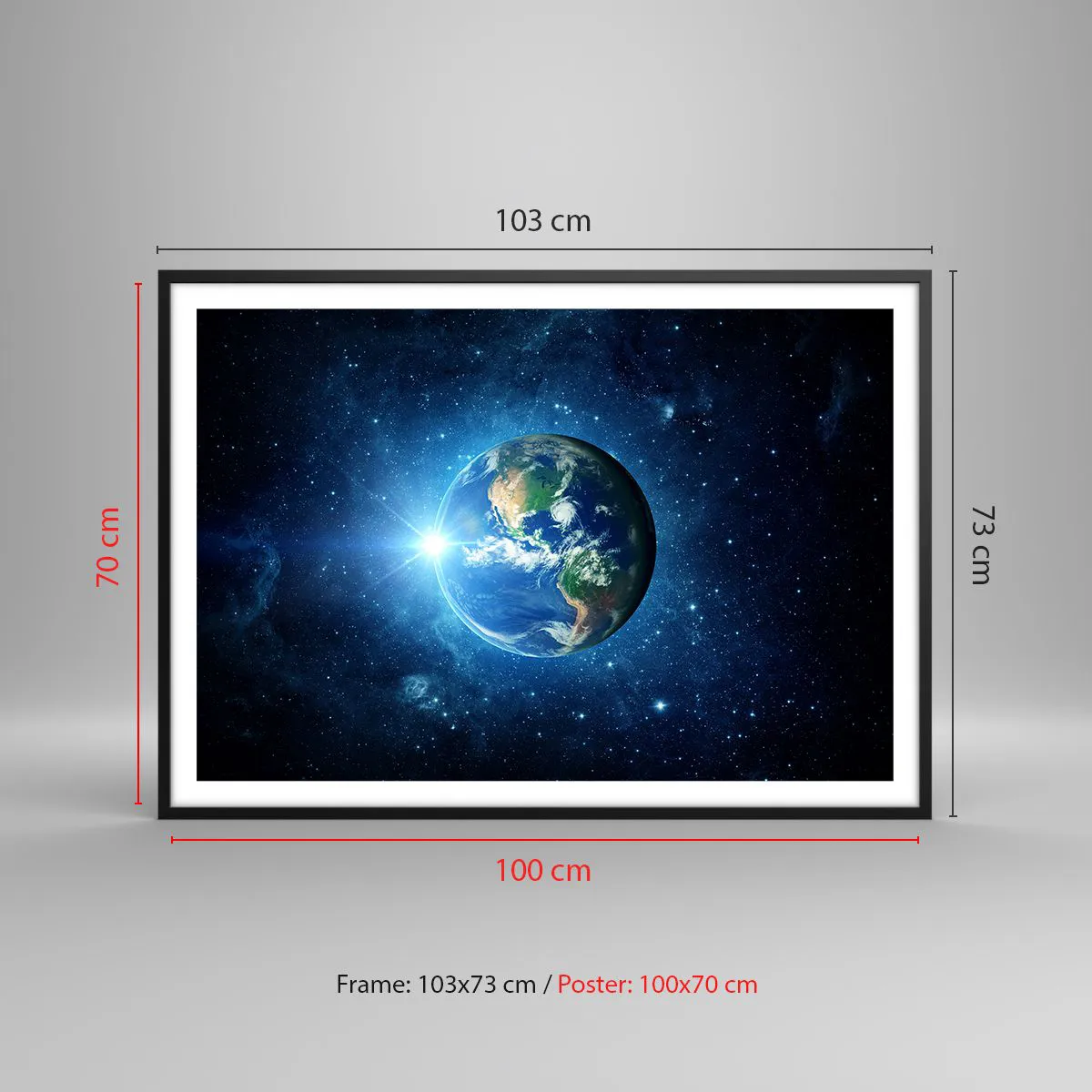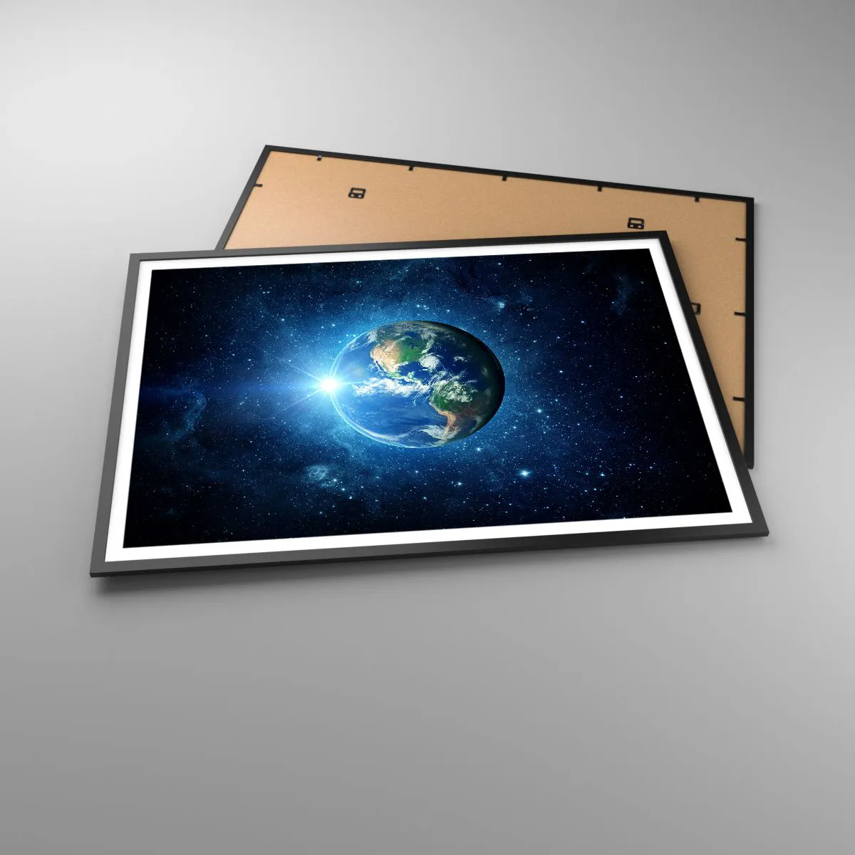 Affiche dans un cadre noir - Poster - La Terre dans l'espace entourée d'étoiles et de lumière - 100x70cm - Nous sommes au paradis - Décoration murale moderne pour le salon et la chambre ARTTOR