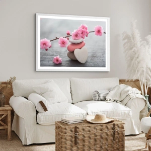 Affiche dans un cadre blanc - Poster - Le bonheur avec une fleur de cerisier - 50x70 cm