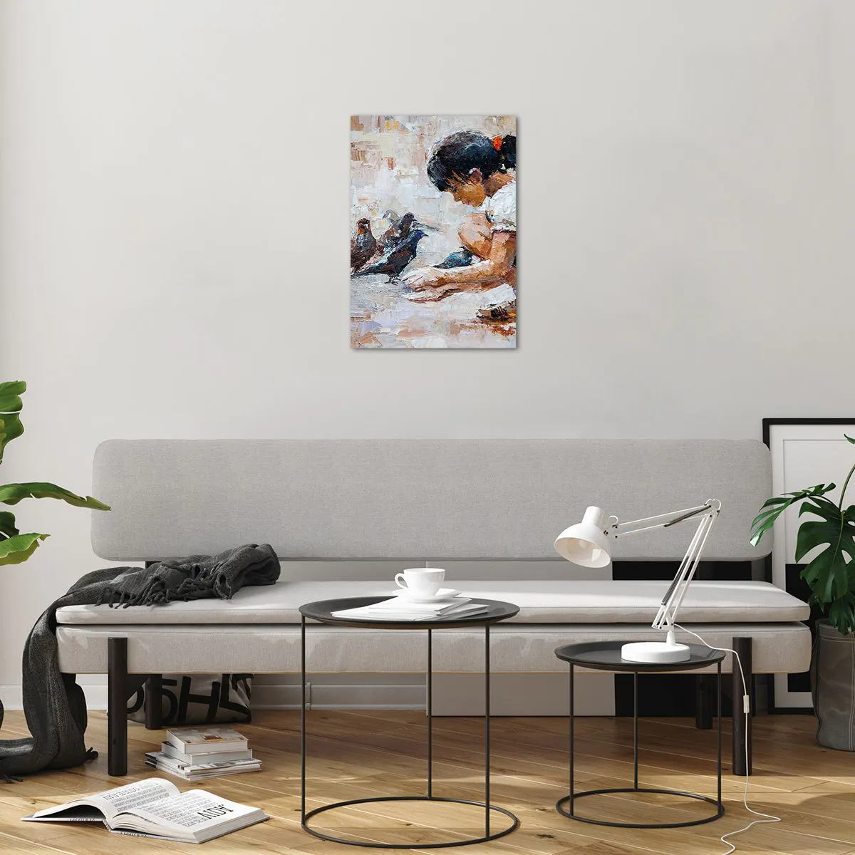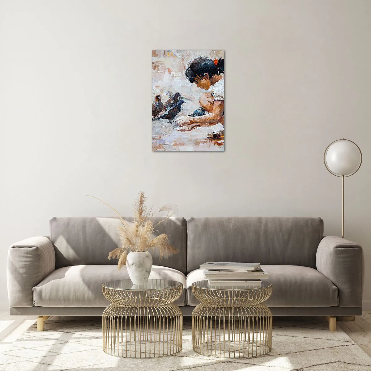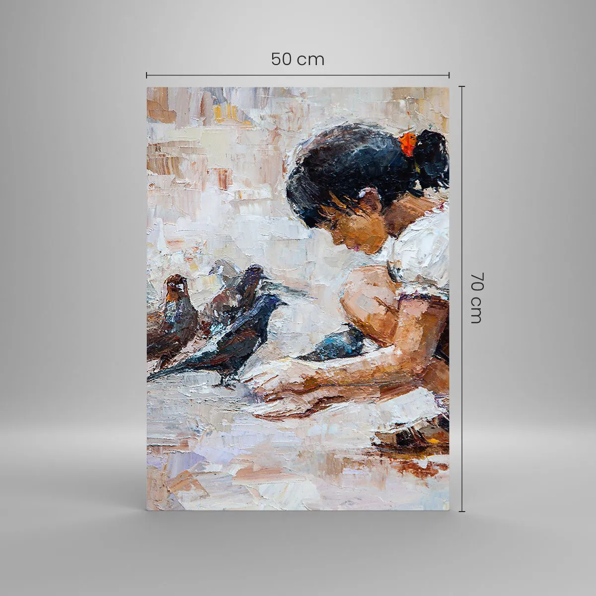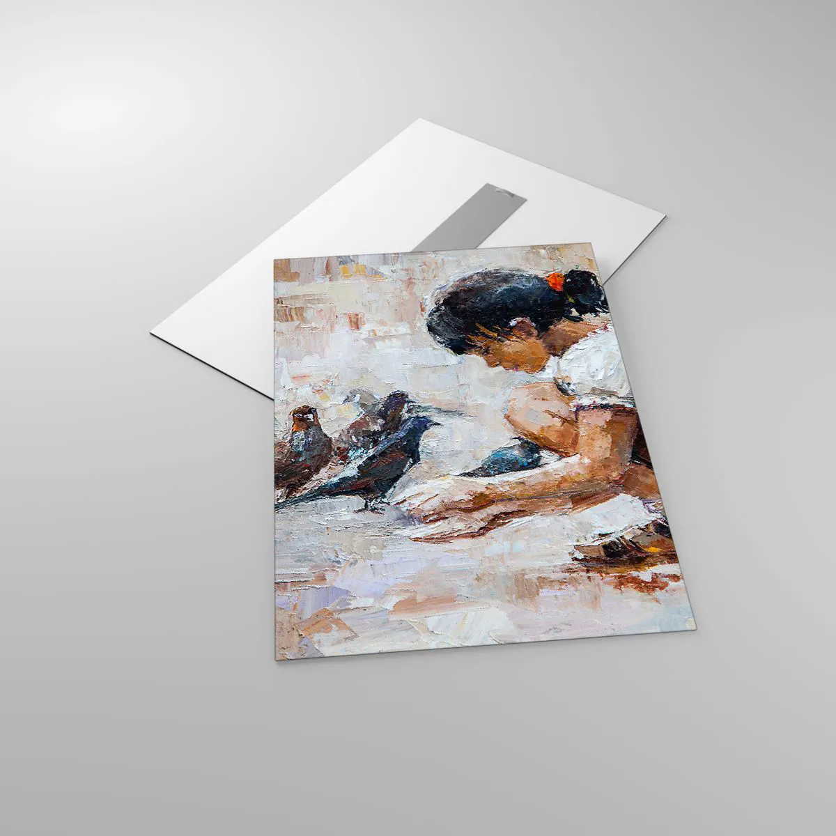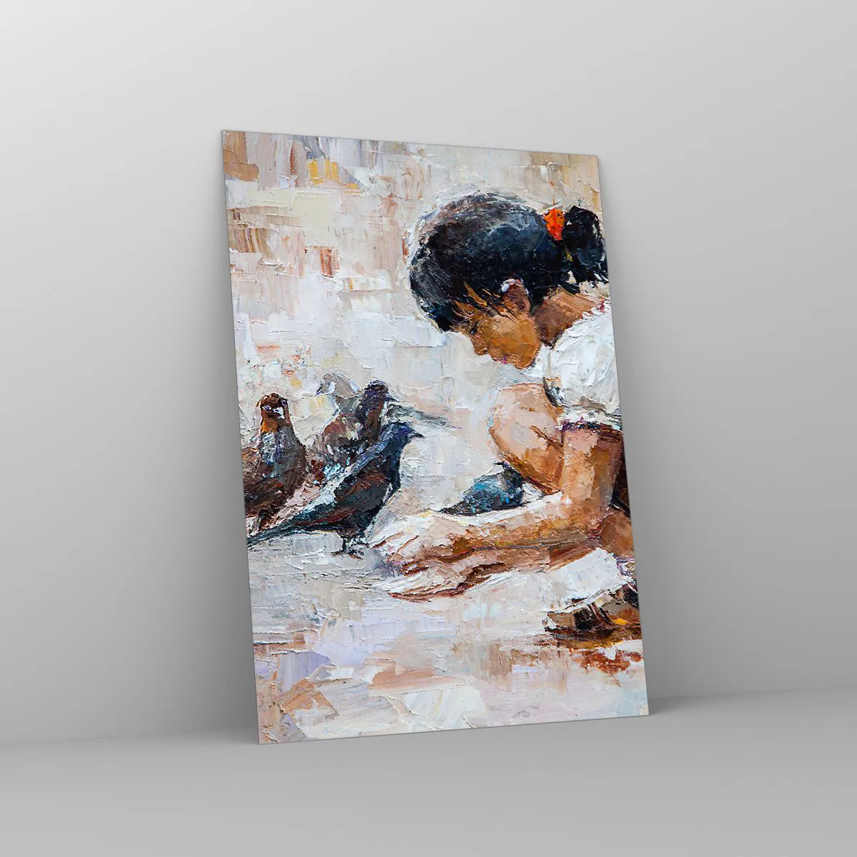 Impression sur verre - Image sur verre - Une fille nourrissant des oiseaux sur un fond impressionniste - 50x70cm - Les plus petits et les plus gentils - Décoration murale moderne pour le salon et la chambre ARTTOR
