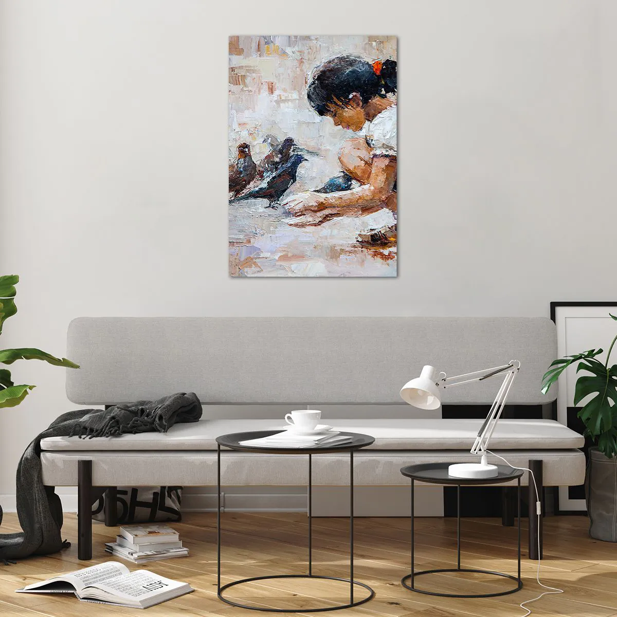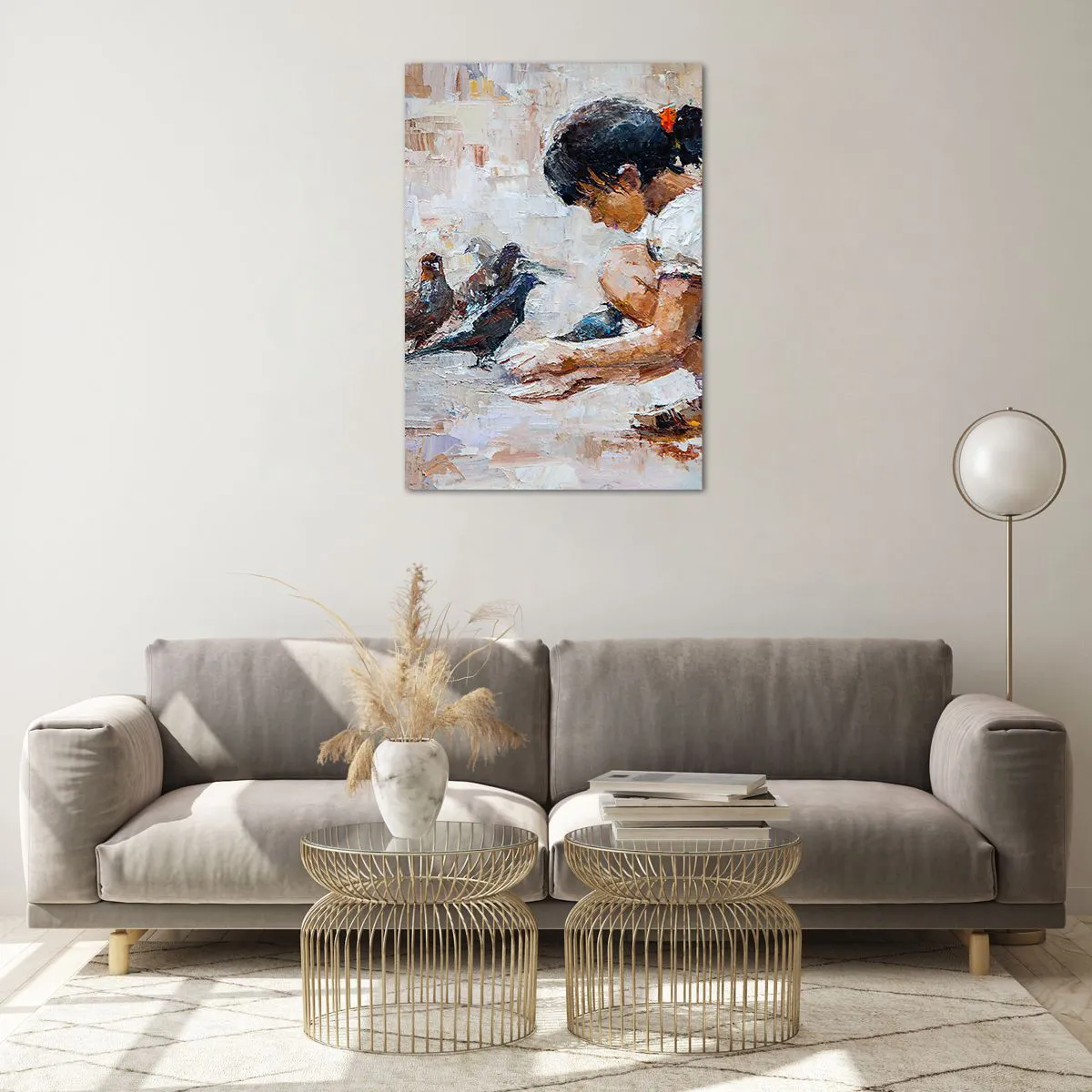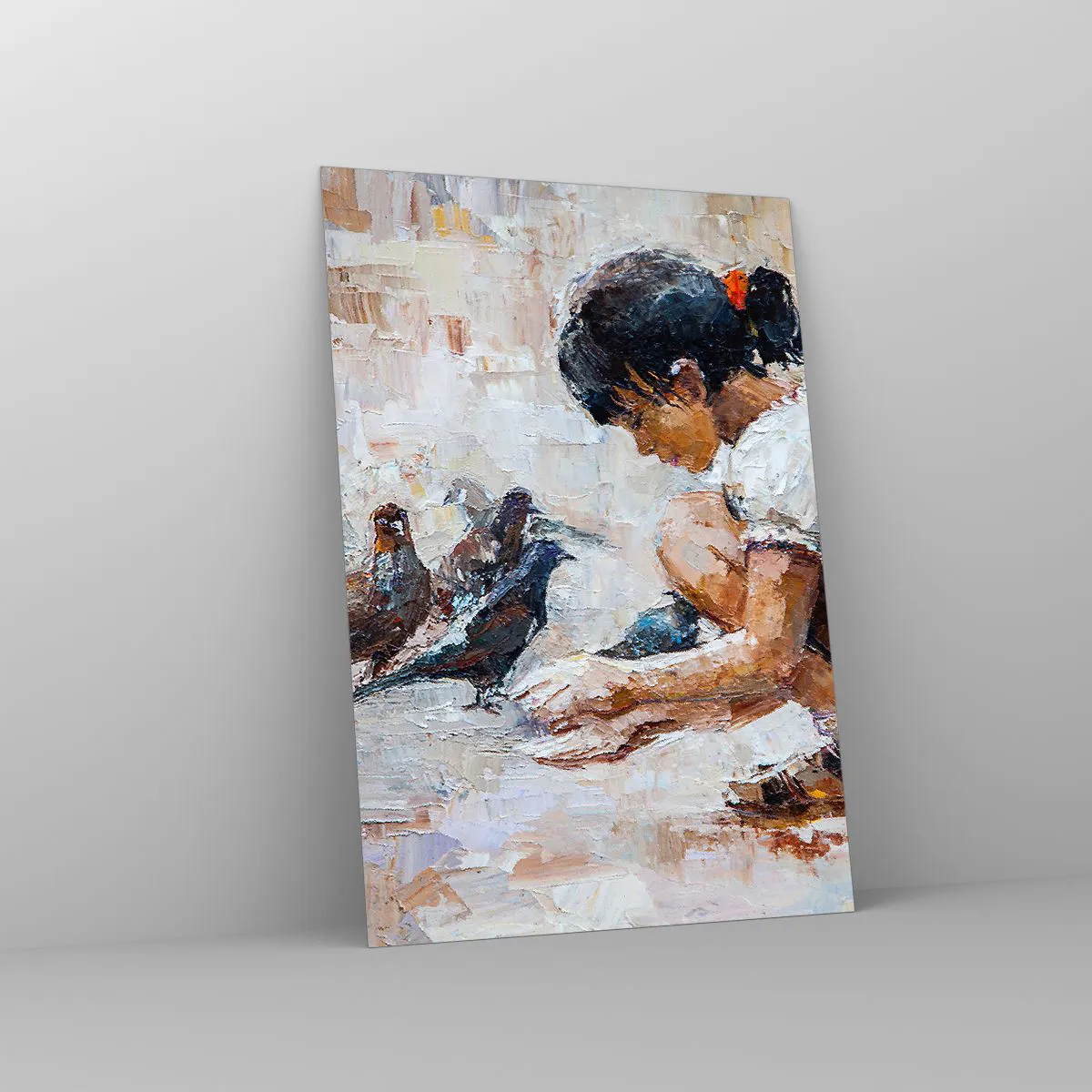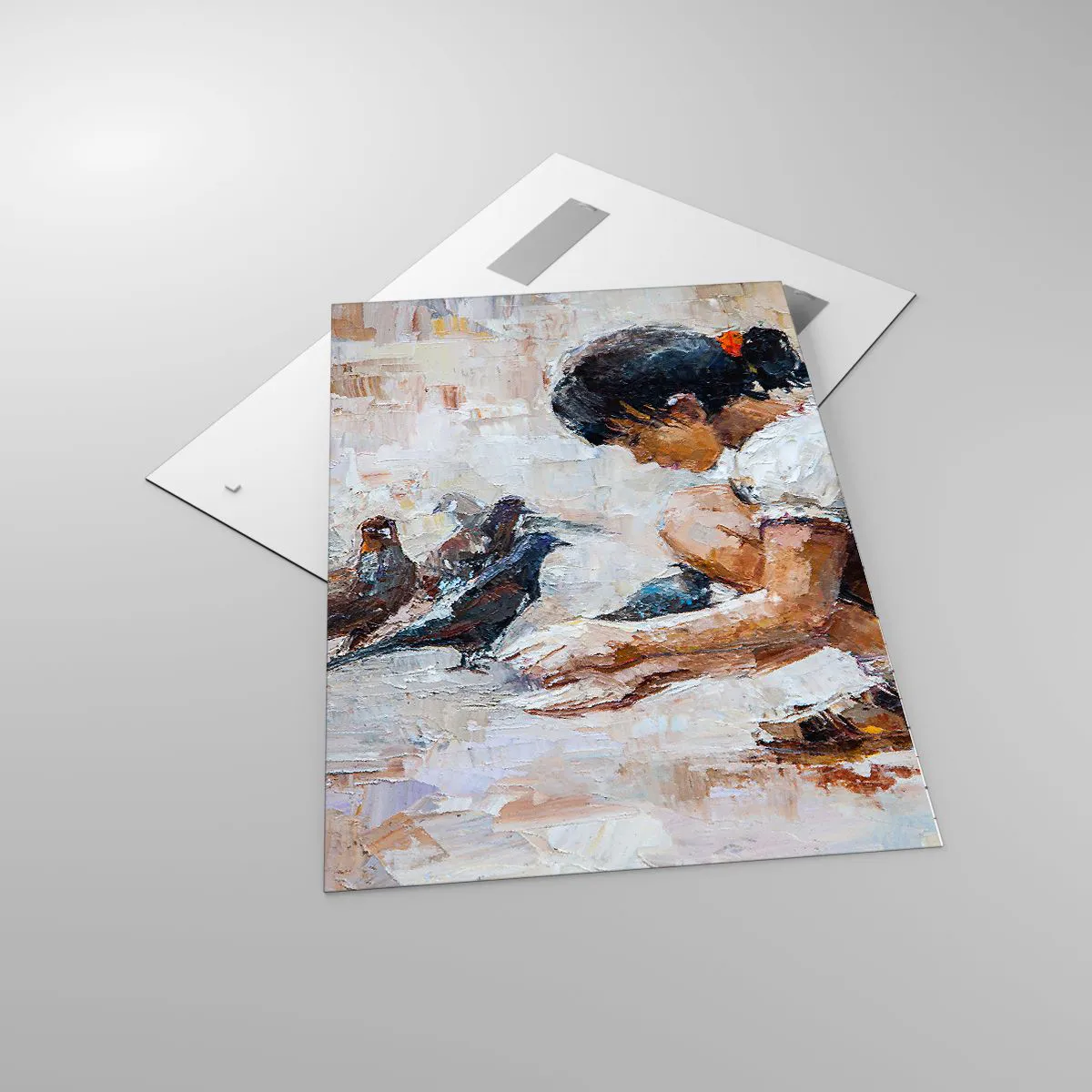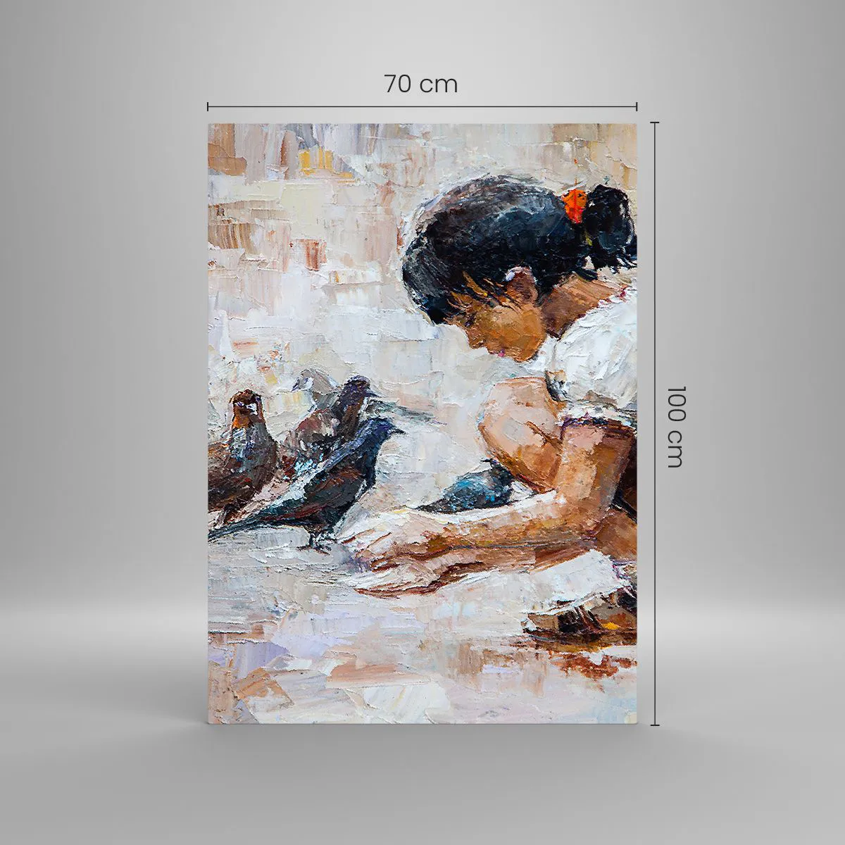 Impression sur verre - Image sur verre - Une fille nourrissant des oiseaux dans un style pictural - 70x100cm - Les plus petits et les plus gentils - Décoration murale moderne pour le salon et la chambre ARTTOR