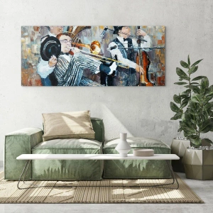 L'impression sur verre « Orchestre de jazz » est une composition unique qui allie l'atmosphère du jazz au style impressionniste artistique. Elle représente trois musiciens jouant des instruments de jazz classiques tels que le trombone, le tuba et la contrebasse, créant une scène dynamique et harmonieuse.