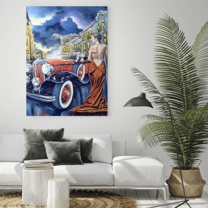 • Un tableau représentant une femme en robe élégante à côté d'une voiture de collection dans un décor urbain nocturne. Un style rétro avec une touche artistique, parfait pour les intérieurs élégants.