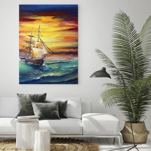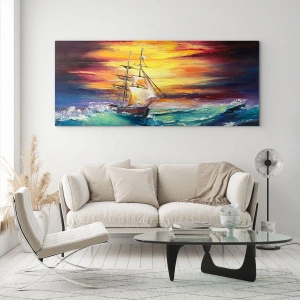 Impression sur verre - Image sur verre - Un voilier sur fond de coucher de soleil coloré - 140x50cm - Courageusement sous les vagues - Décoration murale moderne pour le salon et la chambre ARTTOR