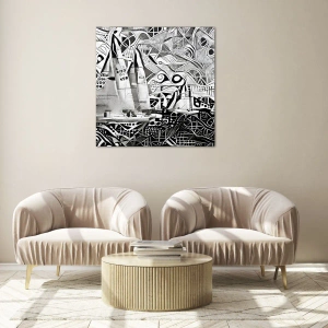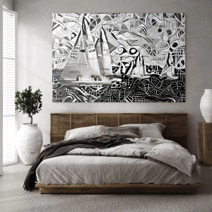 Impression sur verre - Image sur verre - Abstraction en noir et blanc avec voiliers et motifs géométriques - 50x70cm - Entre les vagues - Décoration murale moderne pour le salon et la chambre ARTTOR