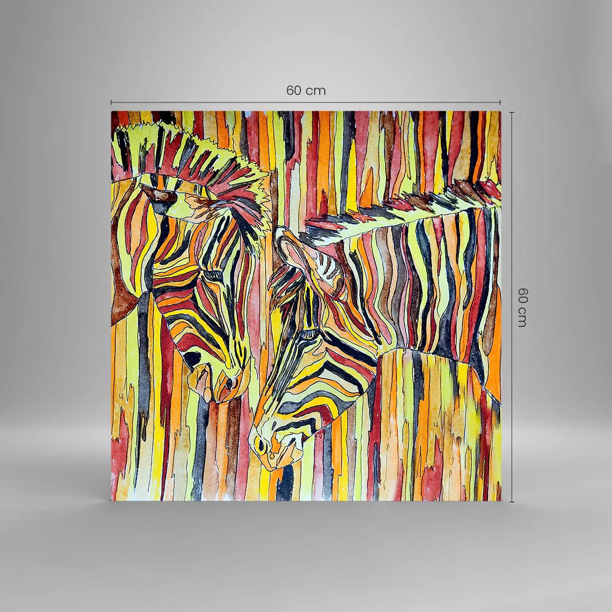 La peinture sur verre est faite sur un verre de 4 mm d'épaisseur. Les bords du verre ont une arête trapézoïdale mate. La tableau est sûr à l'utilisation et prêt à être accroché - il a des crochets en métal attachés à l'arrière du cadre et des entretoises en mousse permettant la régulation uniforme de la distance du tableau au mur.