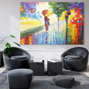 Ce tableau enchante par l'intensité de ses couleurs et ses coups de pinceau dynamiques, qui ajoutent énergie et expression. Les reflets sur l'eau, un jeu de nuances chaudes et froides et les détails subtils des personnages introduisent une sensation de profondeur et de mouvement. L'association de l'art moderne avec le motif classique d'une scène urbaine sous la pluie rend cette œuvre incroyablement intrigante.