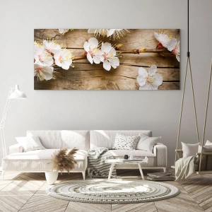 Impression sur verre - Image sur verre - Branches de cerisiers en fleurs sur fond de planche de bois - 120x50cm - Et c'est devenu le printemps - Décoration murale moderne pour le salon et la chambre ARTTOR