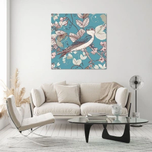 Impression sur verre - Image sur verre - Un oiseau sur une branche dans un style floral délicat - 70x100cm - Dans le bois blanc du rouge et de l'argent - Décoration murale moderne pour le salon et la chambre ARTTOR