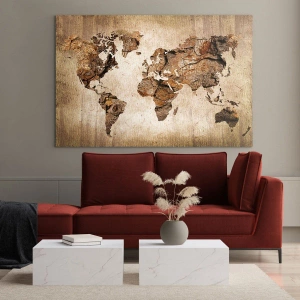 - Une carte du monde aux tons bruns imitant le bois. Un tableau sur verre qui apporte une touche classique à tout intérieur.
