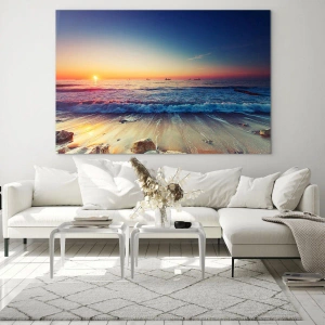 Impression sur verre - Image sur verre - Coucher de soleil sur la plage avec des vagues douces et une mer calme - 100x70cm - Mais quel horizon ? - Décoration murale moderne pour le salon et la chambre ARTTOR