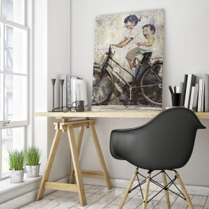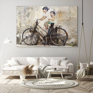 Impression sur verre - Image sur verre - Une peinture murale avec un vélo et des figures d'enfants sur un fond mural. - 50x70cm - Vrai ou faux? - Décoration murale moderne pour le salon et la chambre ARTTOR
