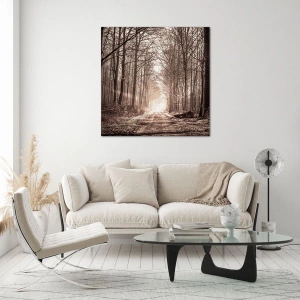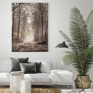 - Le tableau représente un sentier forestier pittoresque entouré d'arbres élancés dans la brume matinale. La lumière du soleil filtre à travers les branches, créant une atmosphère unique et paisible.
