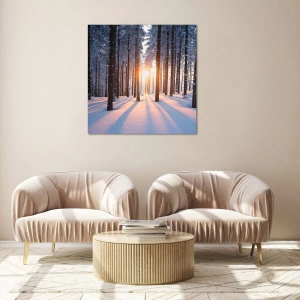 Impression sur verre - Image sur verre - Forêt d'hiver avec les rayons du soleil qui brillent à travers les arbres - 100x70cm - Clairement en noir et blanc - Décoration murale moderne pour le salon et la chambre ARTTOR