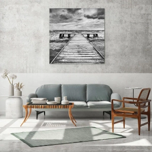 Impression sur verre - Image sur verre - Une vue en noir et blanc d'une jetée en bois sur une mer agitée. - 160x50cm - J'attends que le vent, ça le chassera... - Décoration murale moderne pour le salon et la chambre ARTTOR