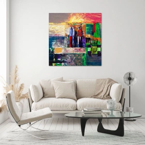 La peinture sur verre est faite sur un verre de 4 mm d'épaisseur. Les bords du verre ont une arête trapézoïdale mate. La tableau est sûr à l'utilisation et prêt à être accroché - il a des crochets en métal attachés à l'arrière du cadre et des entretoises en mousse permettant la régulation uniforme de la distance du tableau au mur.