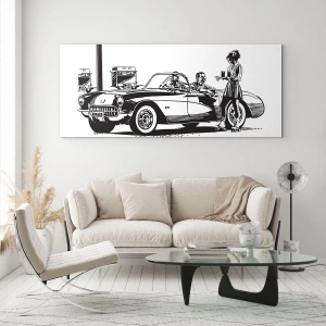 Impression sur verre - Image sur verre - Une scène rétro en noir et blanc avec une voiture et une serveuse en patins à roulettes. - 160x50cm - 60's - Amérique insouciante - Décoration murale moderne pour le salon et la chambre ARTTOR