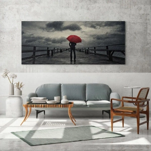La composition visuelle du tableau se compose de l'espace spacieux, presque vide, de la jetée, ce qui renforce le sentiment de solitude. Le parapluie rouge dans les mains de l'homme ajoute de la couleur à ce décor monochrome, rendant le tableau plus expressif et riche en contrastes. Ce tableau est parfait pour les intérieurs minimalistes et modernes, mais il s'intègre également dans des espaces plus classiques.