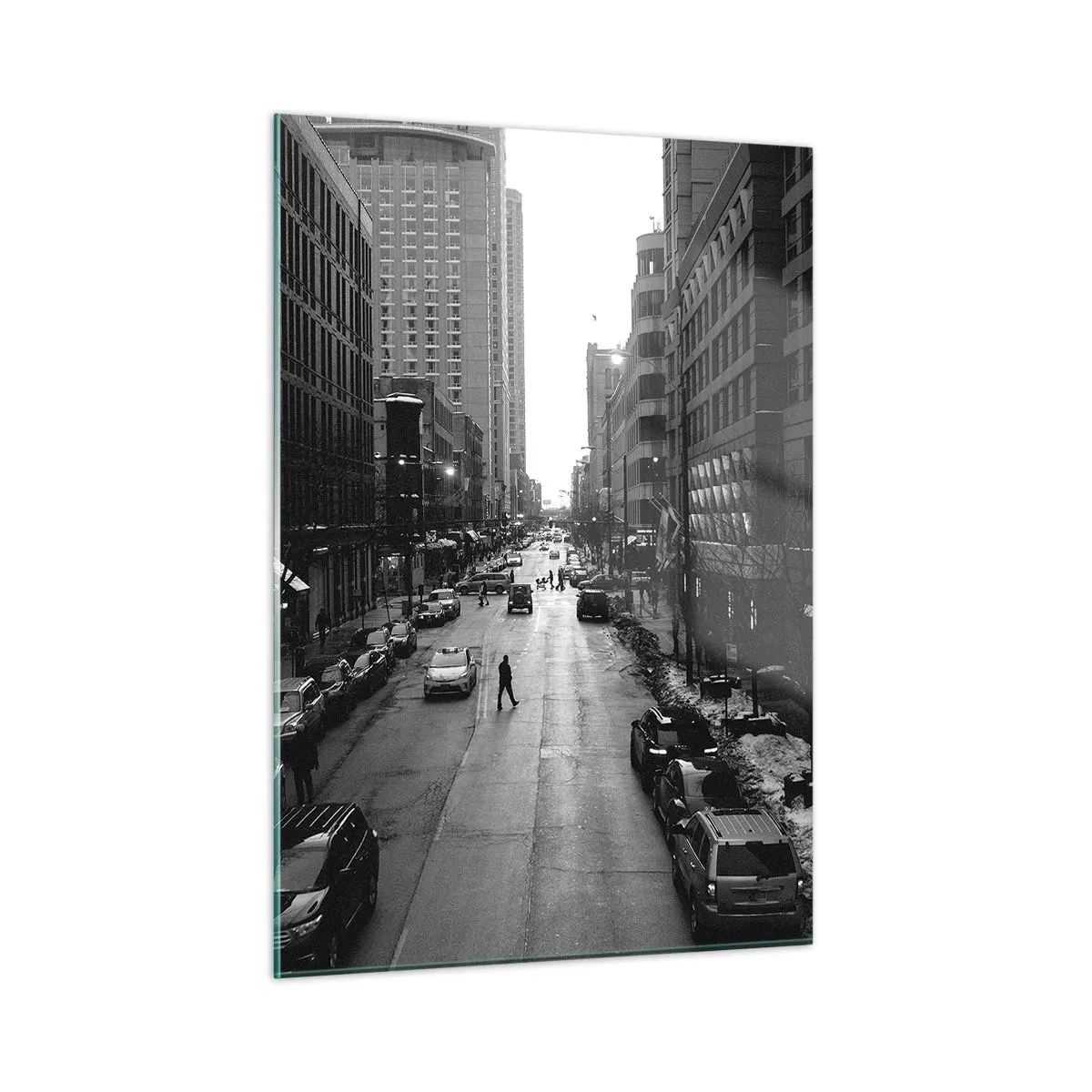 Impression sur verre - Image sur verre - Une rue en noir et blanc avec un passant parmi des bâtiments modernes - 50x70cm - Un autre jour comme tous les autres jours - Décoration murale moderne pour le salon et la chambre ARTTOR