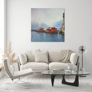 Impression sur verre - Image sur verre - Un port avec des bateaux rouges entouré d'un paysage brumeux - 80x120cm - Na końcu świata - Décoration murale moderne pour le salon et la chambre ARTTOR