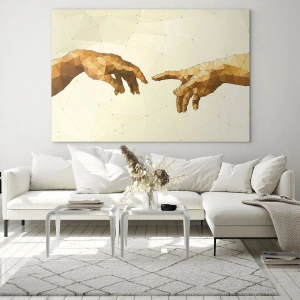 Impression sur verre - Image sur verre - Une version stylisée du tableau « La Création d'Adam » en technique polygonale - 100x70cm - Géométrie divine - Décoration murale moderne pour le salon et la chambre ARTTOR