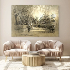 Impression sur verre - Image sur verre - Un dessin d'un parc avec des sentiers et des gens qui marchent - 70x50cm - Un moment arrêté avec une plume - Décoration murale moderne pour le salon et la chambre ARTTOR