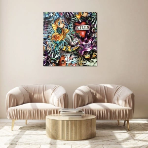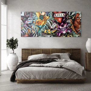 Impression sur verre - Image sur verre - Œuvre d'art colorée de style tatouage avec des crânes et des motifs nautiques - 120x50cm - Le rêve du tatoueur - Décoration murale moderne pour le salon et la chambre ARTTOR