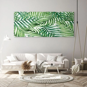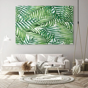 Impression sur verre - Image sur verre - Feuilles de palmier vertes sur fond blanc créant un motif géométrique - 50x70cm - Sous la canopée verte - Décoration murale moderne pour le salon et la chambre ARTTOR