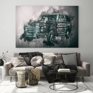 • Ce tableau rétro représentant une vieille voiture présente un fond gris et des touches turquoise. Il s'intègre parfaitement aux intérieurs industriels ou vintage, leur conférant une atmosphère unique.