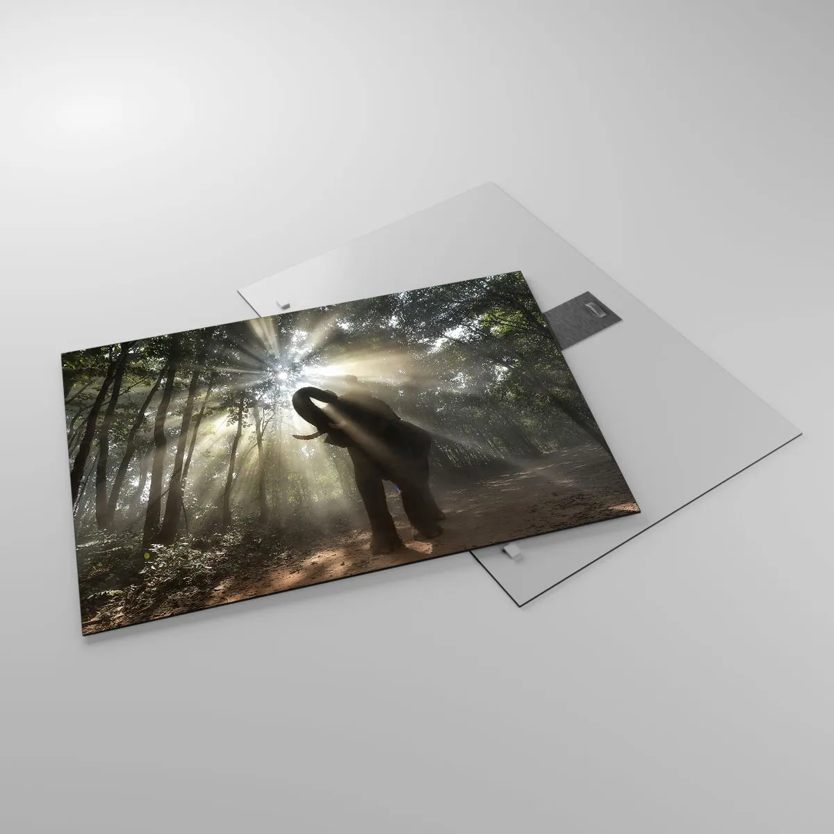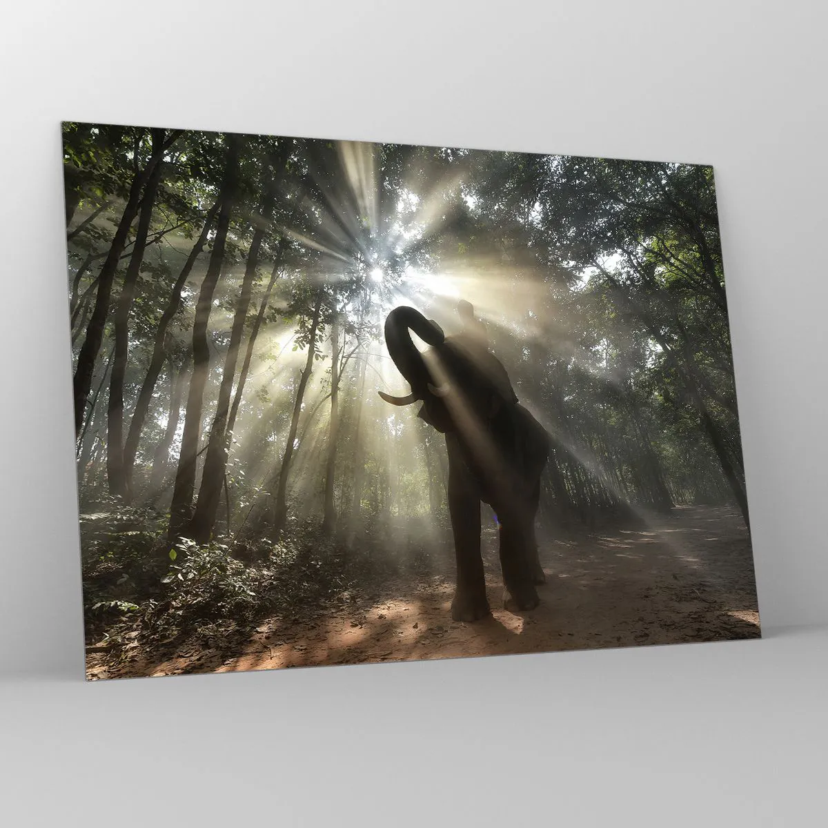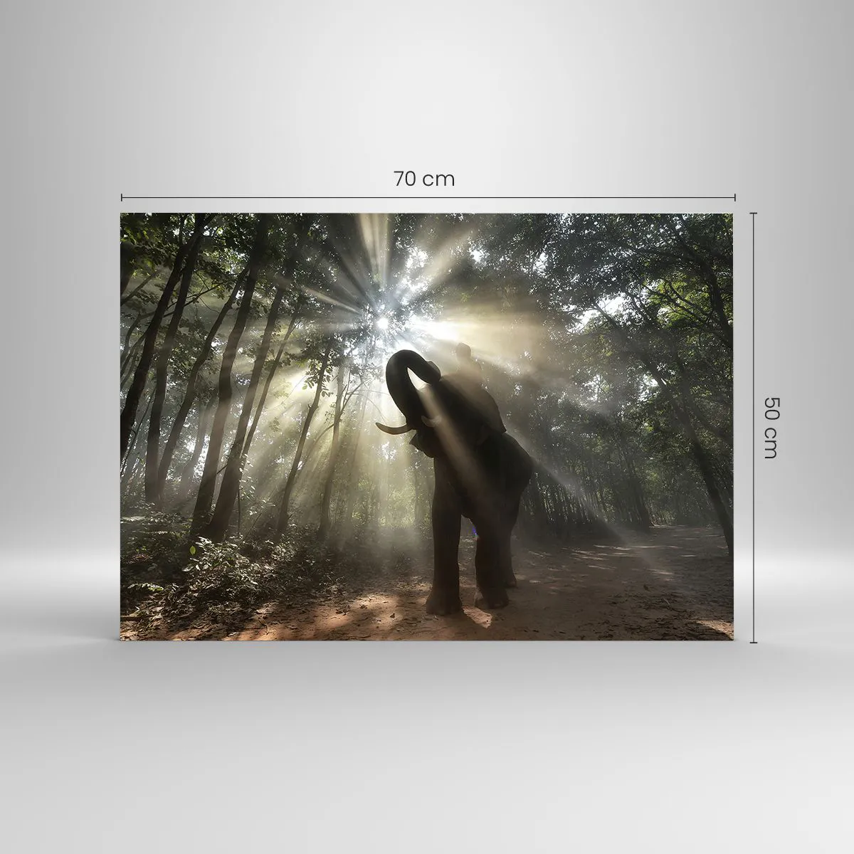 Impression sur verre - Image sur verre - Un éléphant dans une forêt éclairée par la lumière du soleil - 70x50cm - Sous la bonne étoile - Décoration murale moderne pour le salon et la chambre ARTTOR