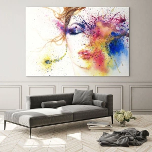 Impression sur verre - Image sur verre - Portrait abstrait d'une femme avec des éclaboussures de peinture arc-en-ciel - 100x70cm - Vertiges arc-en-ciel - Décoration murale moderne pour le salon et la chambre ARTTOR