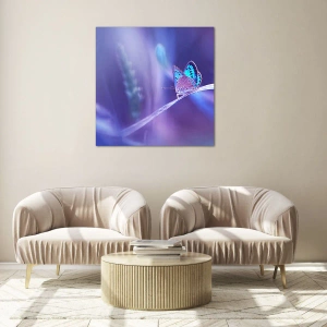 Impression sur verre - Image sur verre - Un délicat papillon bleu sur une tige dans une lumière violette - 120x50cm - Un joyau de la nature - Décoration murale moderne pour le salon et la chambre ARTTOR