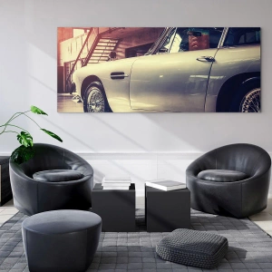 Impression sur verre - Image sur verre - Une voiture classique dans un garage élégant avec un intérieur industriel - 140x50cm - Les classiques ne vieillissent pas - Décoration murale moderne pour le salon et la chambre ARTTOR