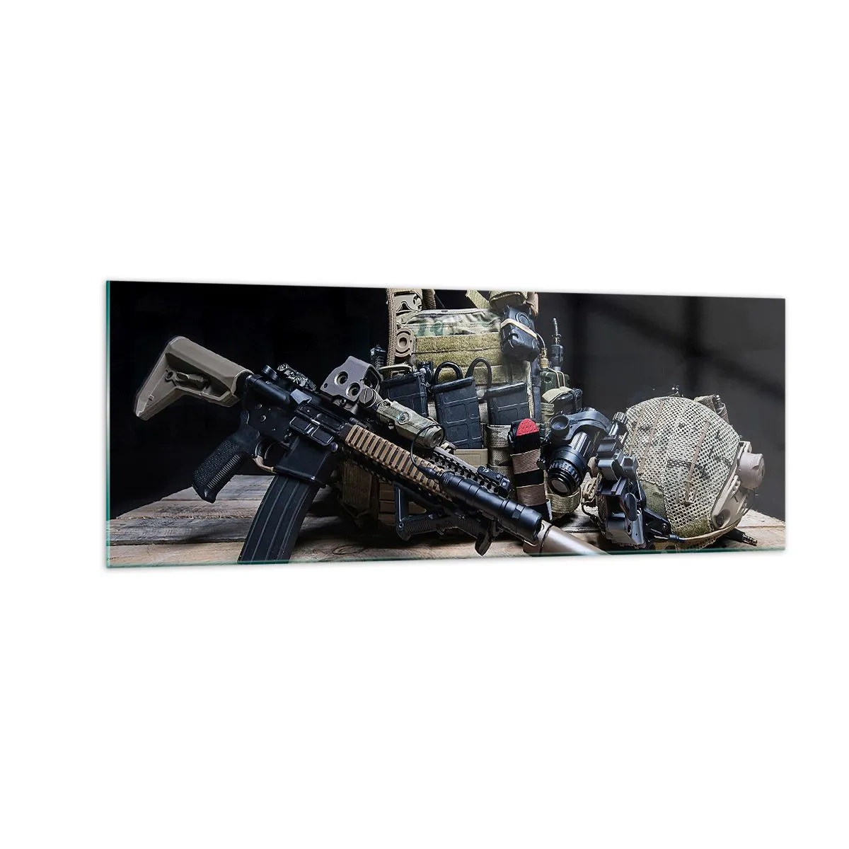 Impression sur verre - Image sur verre - Équipement tactique avec un fusil sur une table en bois - 140x50cm - Se reposer! - Décoration murale moderne pour le salon et la chambre ARTTOR