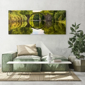 Impression sur verre - Image sur verre - Un pont de pierre se reflétant dans la surface calme du lac - 50x70cm - À la jonction de deux mondes - Décoration murale moderne pour le salon et la chambre ARTTOR