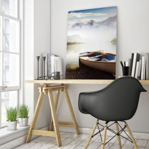 Impression sur verre - Image sur verre - Un bateau sur un lac entouré de montagnes au lever du soleil - 100x70cm - Au bord de la grande et limpide eau - Décoration murale moderne pour le salon et la chambre ARTTOR