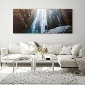 Impression sur verre - Image sur verre - Une silhouette sur fond de cascade majestueuse dans une gorge rocheuse - 160x50cm - Restauration des proportions - Décoration murale moderne pour le salon et la chambre ARTTOR