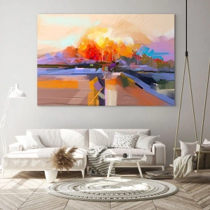 Impression sur verre - Image sur verre - Paysage abstrait avec un coucher de soleil et des champs colorés - 50x70cm - L'automne est arrivé - Décoration murale moderne pour le salon et la chambre ARTTOR