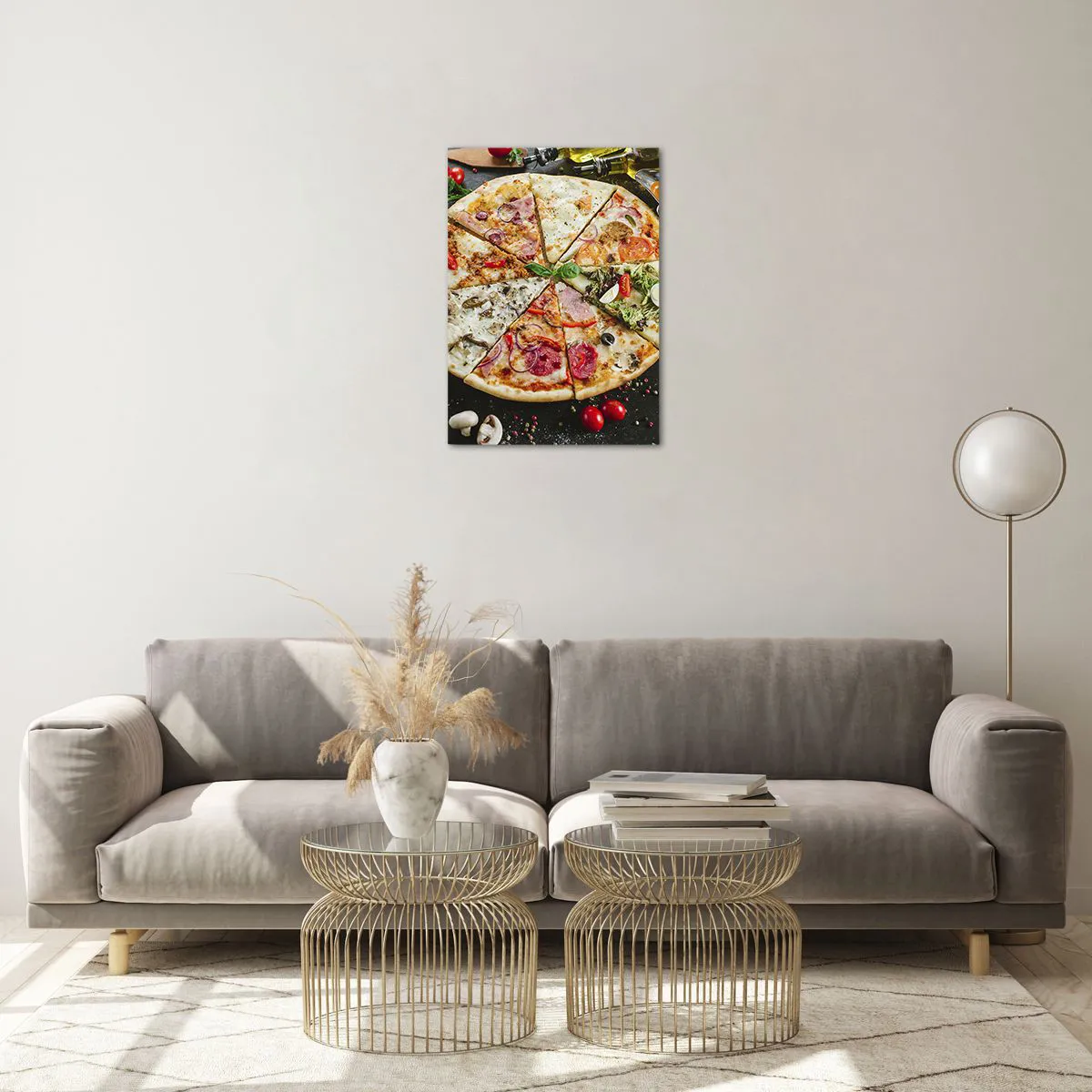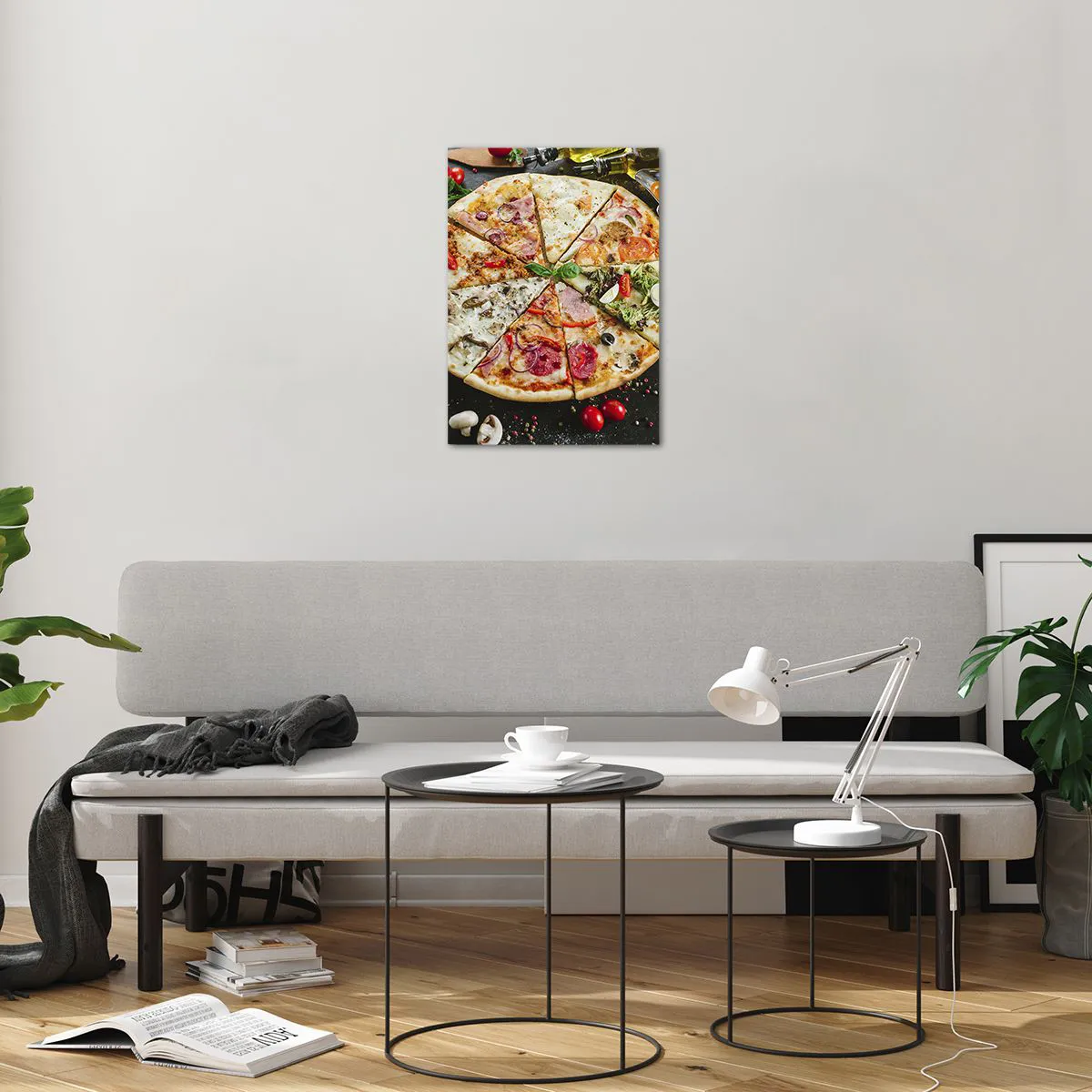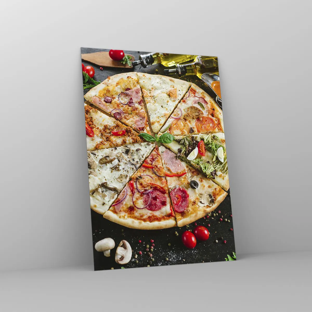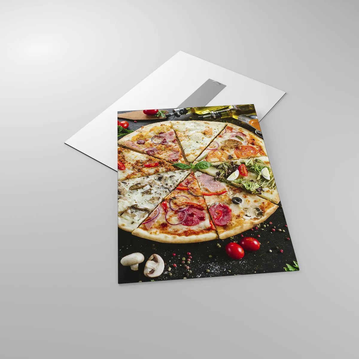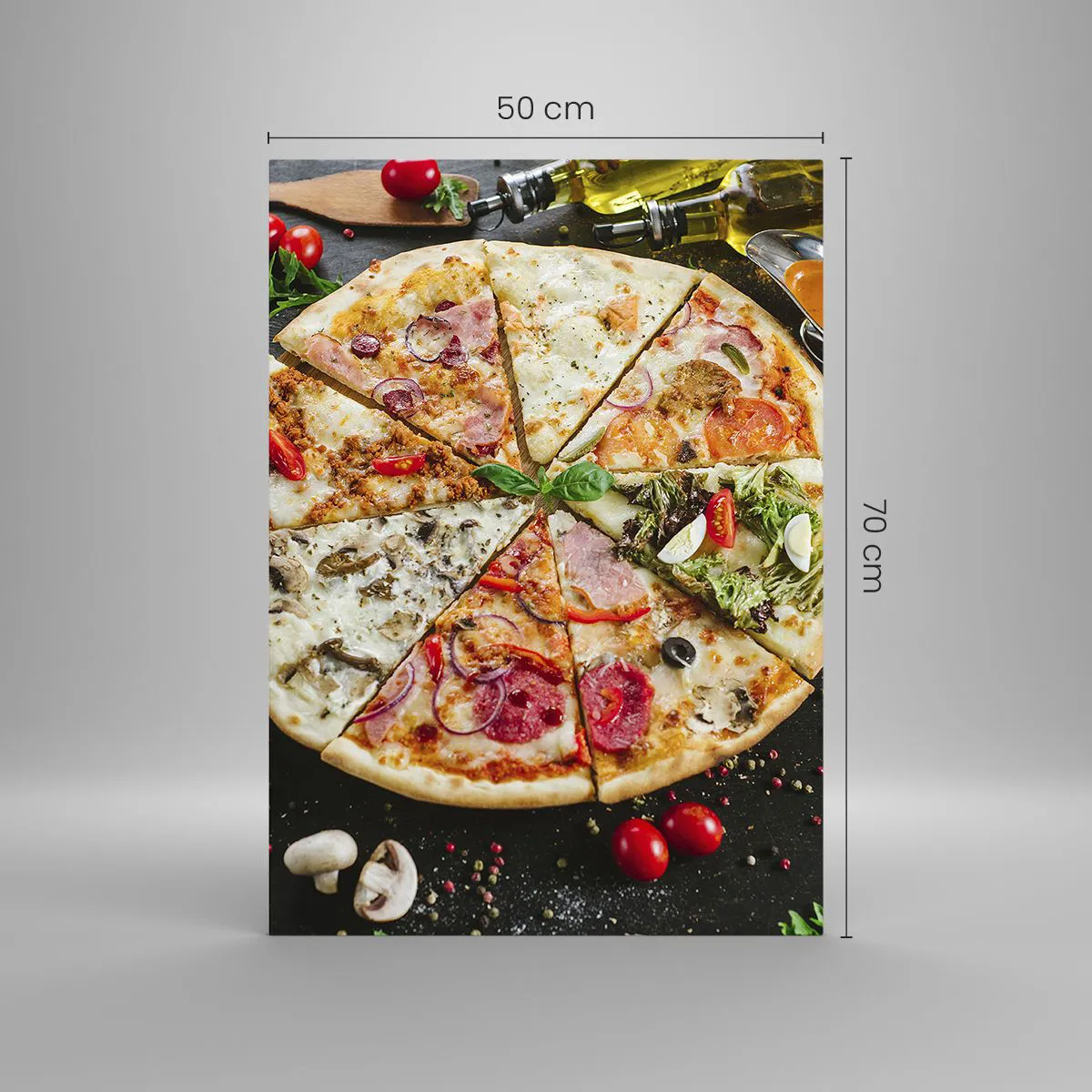 Impression sur verre - Image sur verre - Pizza aux saveurs variées avec garnitures sur fond sombre - 50x70cm - Une gamme de saveurs - Décoration murale moderne pour le salon et la chambre ARTTOR