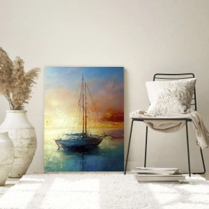 - Ce tableau artistique représente un voilier naviguant sur une mer calme, illuminé par la lueur dorée du soleil couchant. Une décoration unique qui apporte harmonie et élégance à tout intérieur.